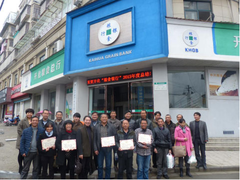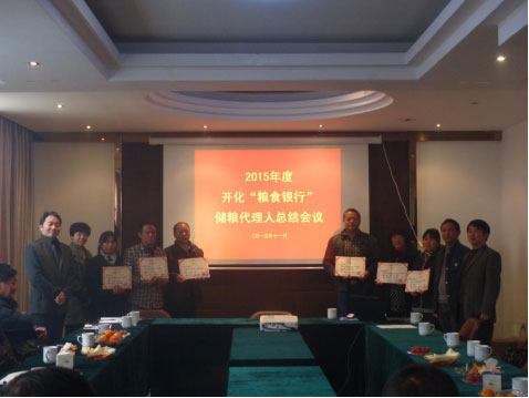 2015年11月29日早上9:00,开化“粮食银行”2015年度总结表彰会议在粮食银行总部顺利召开,出席会议的有公司董事长叶忠兴、总经理助理徐小红,会计总监程其彬、粮食银行负责人俞深根及所有2015年储粮代理人。