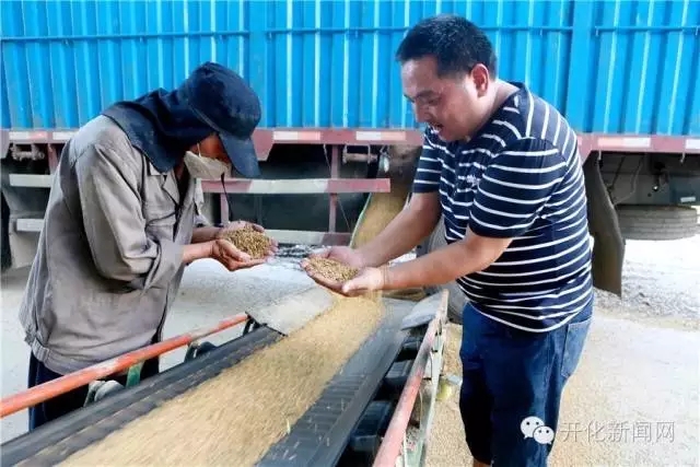 7月25日,记者在开化工业园区浙江中兴粮油有限公司车间看见,一辆装载着30多吨稻谷的运粮车通过自动传送带,把新鲜稻谷送入大型烘干机入口处准备烘干。