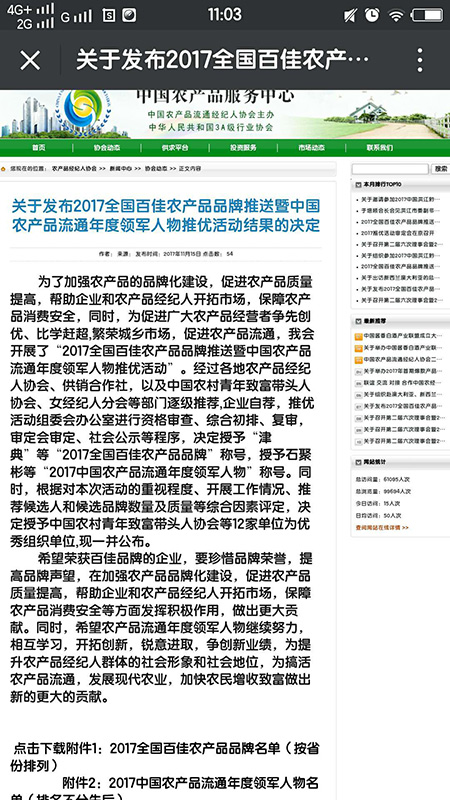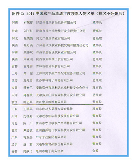 为了加强农产品的品牌化建设,促进农产品质量提高,中国农产品流通经纪人协会开展了“2017全国百佳农产品品牌推送暨中国农产品流通年度领军人物推优活动”。2 经过各地农产品经纪人协会、供销合作社,以及中国农村青年致富带头人协会、女经纪人分会等部门逐级推荐,推优活动组委会办公室进行资格审查、综合初排、复审,审定会审定、社会公示等程序,浙江中兴粮油有限公司董事长叶忠兴被授予“2017中国农产品流通年度领军人物”称号。